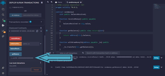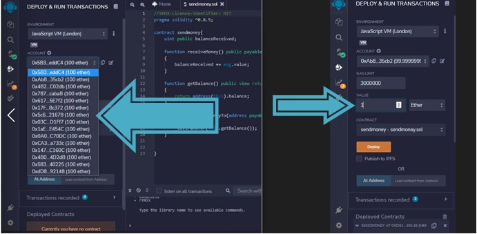 **步驟 6** - 要進行交易,我們需要**多個具有不同地址的賬戶**,這些賬戶由 Remix 本身提供用於初始開發**(左圖)**,我們還**為交易提及“1”個代幣(以太坊)**(右圖)**。同時選擇兩個賬戶來發送和接收以太坊。
