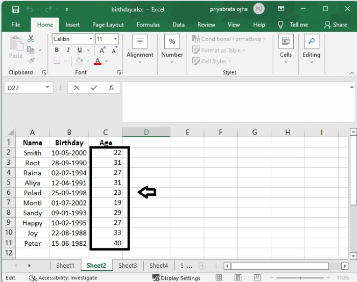 **步驟1 -** 此外,已根據出生日期確定每個人的年齡,如螢幕截圖所示: