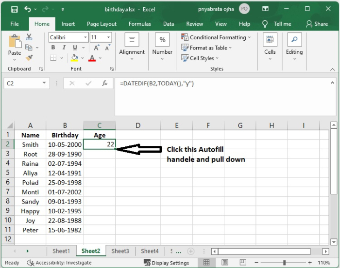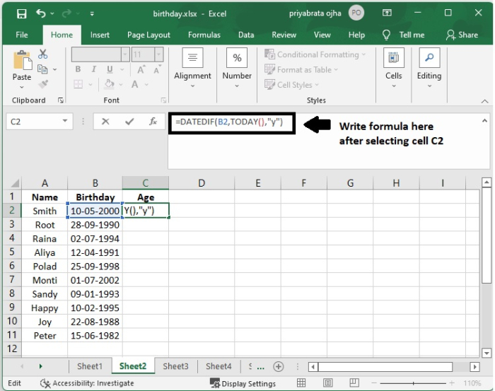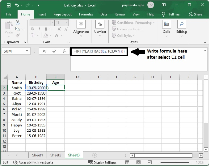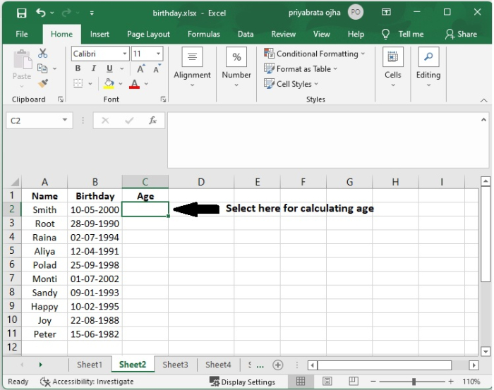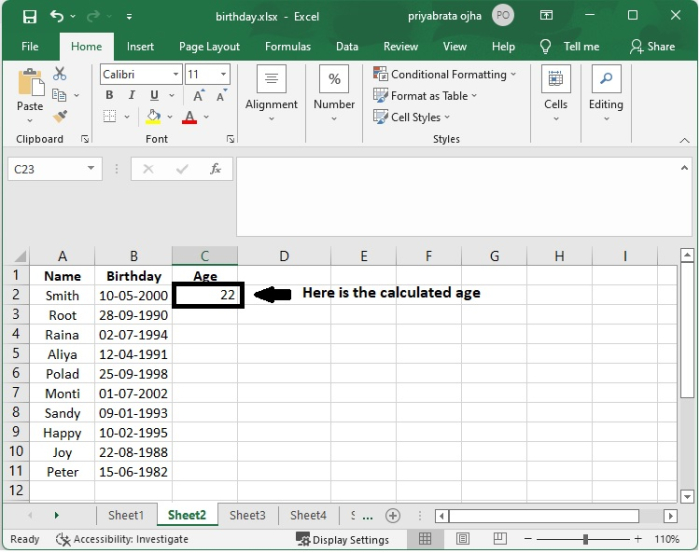 **步驟3 -** 下面顯示了在C2單元格中計算Smith年齡的結果。