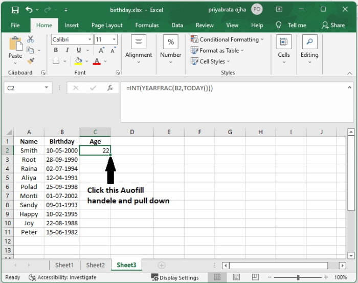 **步驟4 -** 之後,只需將填充柄向下拖動到您希望應用此公式的單元格。此時,所有年齡都將計算出來,並在單元格中以十進位制值的形式顯示。