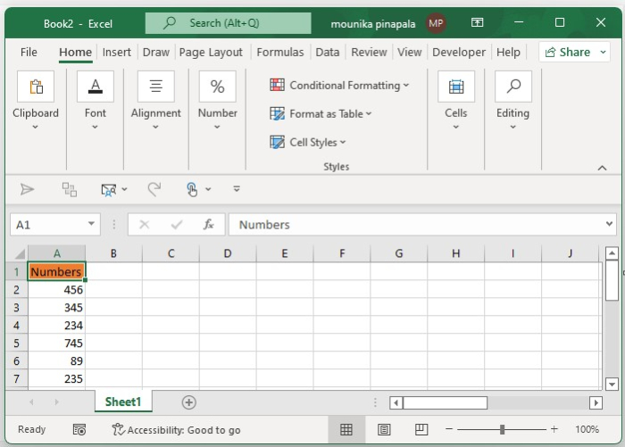 開啟一個 Microsoft Excel 表格,並根據需要輸入數字,如下面的螢幕截圖所示,供您參考。