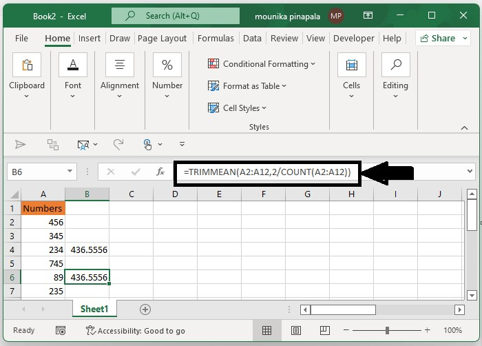 當您在 Microsoft Excel 表格中使用上述兩個公式時,得到的結果相同,為 436.5556,如上面的螢幕截圖所示。