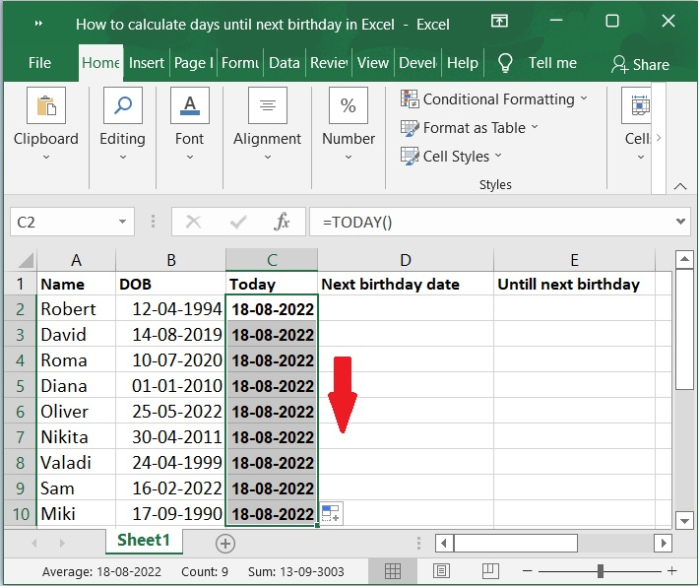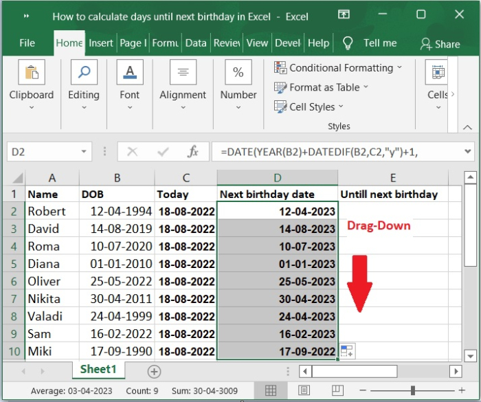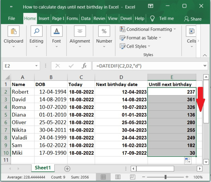 距離您下次生日還剩的天數將顯示在E2單元格中,並將填充柄拖到其範圍的底部。請檢視下面的螢幕截圖。