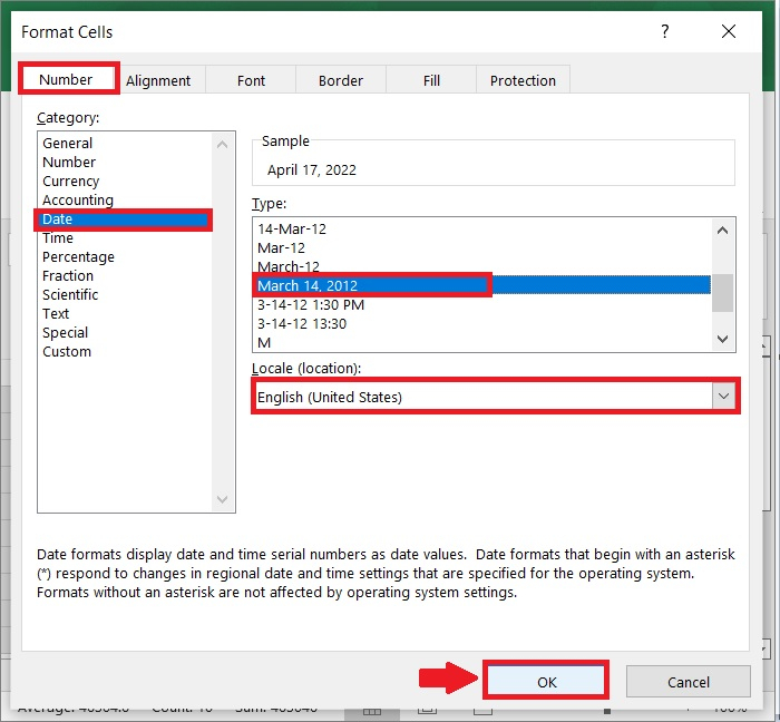 在顯示的“設定單元格格式”對話方塊中單擊“數字”選項卡,然後從“分類”窗格中選擇“日期”。之後,從右側列表框中選擇您喜歡的日期格式,然後單擊“確定”按鈕關閉對話方塊,如下面的截圖所示。