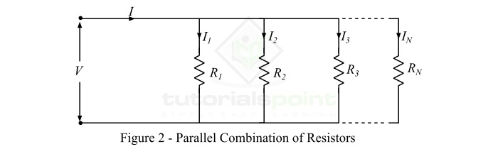 現在,為了理解並聯電阻組合的等效電阻計算過程,考慮N個電阻並聯連線,如圖2所示。從圖2可以看出,所有電阻器上的電壓相同,都等於V伏特,但每個電阻器上的電流不同,取決於電阻值。