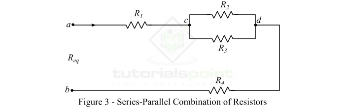 有時,我們會遇到一些電路,其中一些電阻器串聯連線,另一些電阻器並聯連線。這種電阻器組合通常被稱為串並聯電阻組合。圖3顯示了一個電阻網路,其中電阻器以串並聯方式連線。