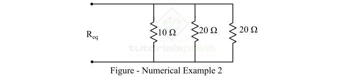 $$\mathrm{\frac{1}{R_{eq}} =\frac{1}{10}+\frac{1}{20}+\frac{1}{20} }$$