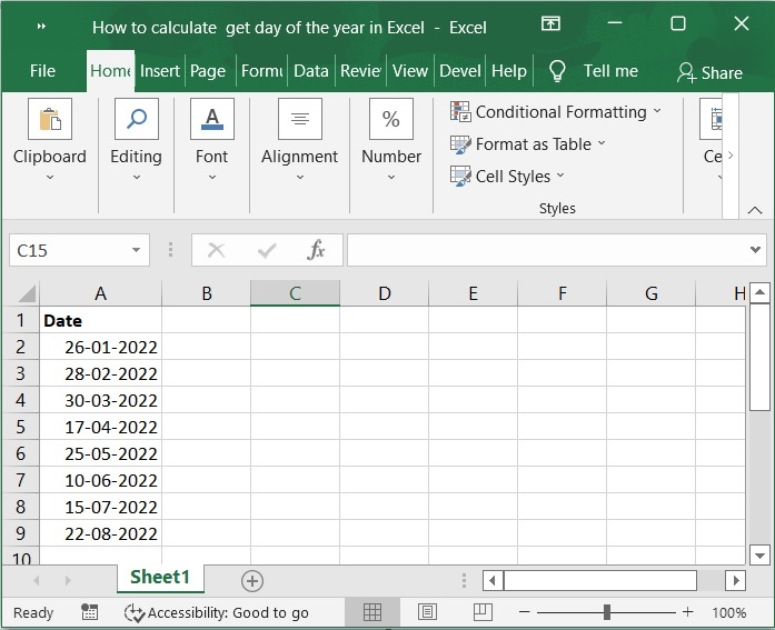 在第一步中,假設我們有一些樣本資料來計算或獲取一年中的第幾天。請參考下面的螢幕截圖。