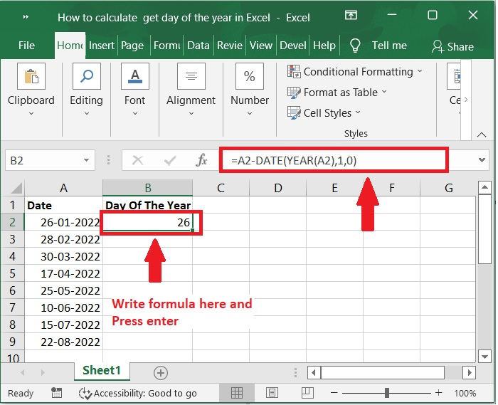 重要說明 - A2 已經包含您希望用於確定一年中的第幾天的日期,但您可以根據需要對其進行修改。