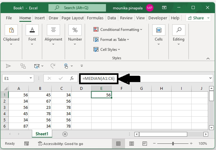 在上述公式中,A1:C3 和 E1:G3 是您要從中計算中位數的範圍,然後逗號表示“和”。