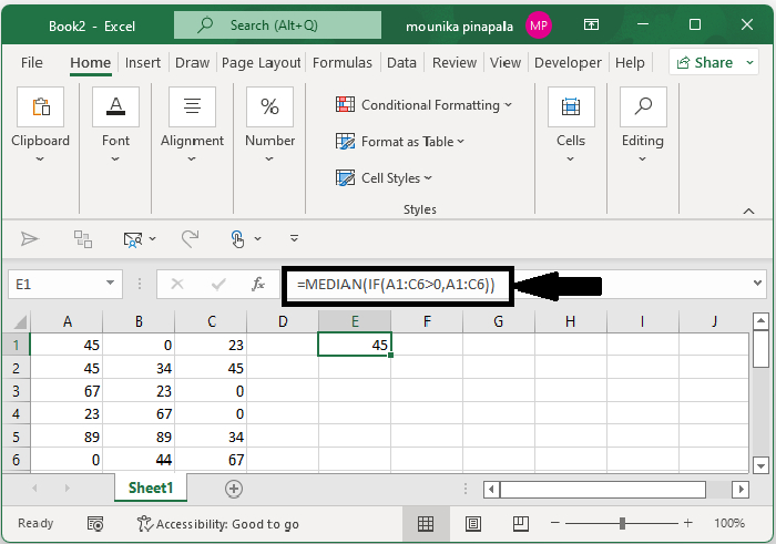 =MEDIAN(IF(A1:C6>0,A1:C6))