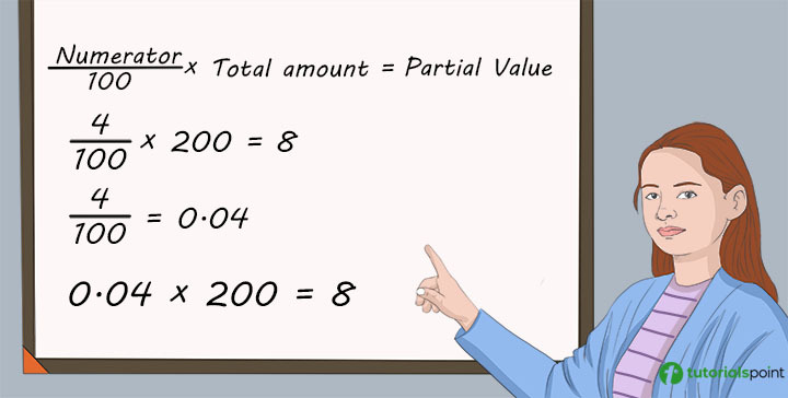 這是一個簡單的方法。假設要求你找到200桶葡萄酒的4%。將3作為分子,100作為分母,即4/100,然後乘以總量,即200桶葡萄酒。