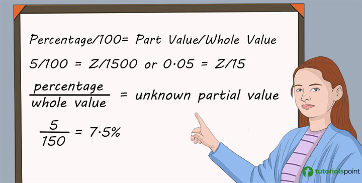這也可以表示為X的Y等於Z,其中X是百分比,Y是根據計算所做的整體值,Z是未知的部分值。換句話說,在這個例子中,這個語句可以改寫為5%的150等於Z,結果為7.5。