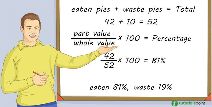 如果給定一個部分值,並且想要找到剩餘部分百分比的百分比,而不知道整體——有一種快速簡便的方法可以做到這一點。在一次餐飲活動中,吃了42個餡餅,浪費了10個。我們如何找到消耗的餡餅佔總數的百分比?