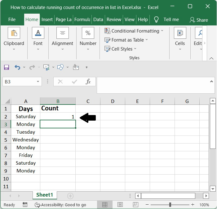 之後,COUNTIF函式將計算範圍內具有值“星期一”的單元格數量,結果將是執行計數。