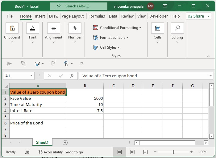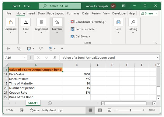 注意 − 在上述公式中,B18 為年利率,B20 為實際期限,B17*B21 為獲得的利息,B17 為面值。您可以根據需要更改這些值。