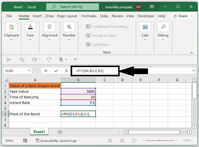注意 − 在上述公式中,B4 為利率,B3 為到期年數,0 表示無息票,B2 為面值。您可以根據需要更改這些值。