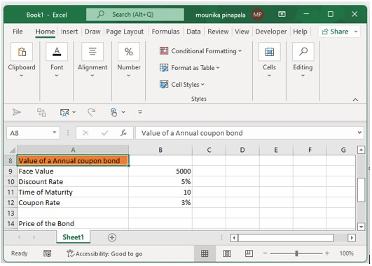 假設有一筆年息債券,債券持有人每年可以獲得利息。您可以使用以下方法計算年息債券的價格。