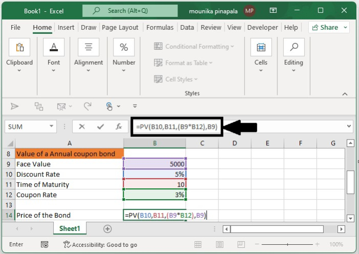注意 − 在上述公式中,B10 為利率,B11 為到期年數,B9 為面值,B9*B12 為每年獲得的利息。您可以根據需要更改這些值。