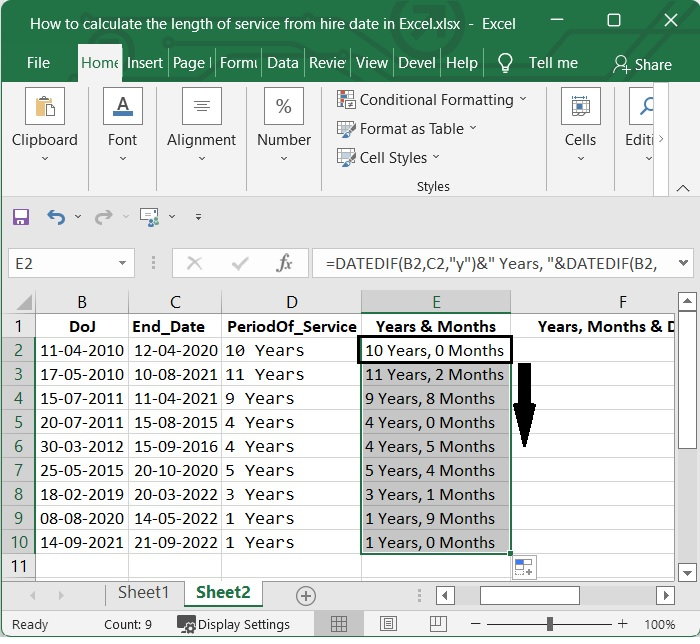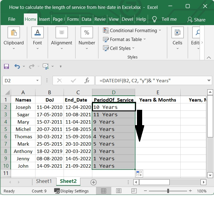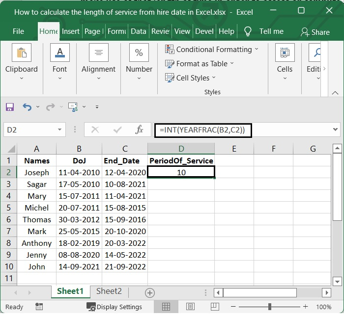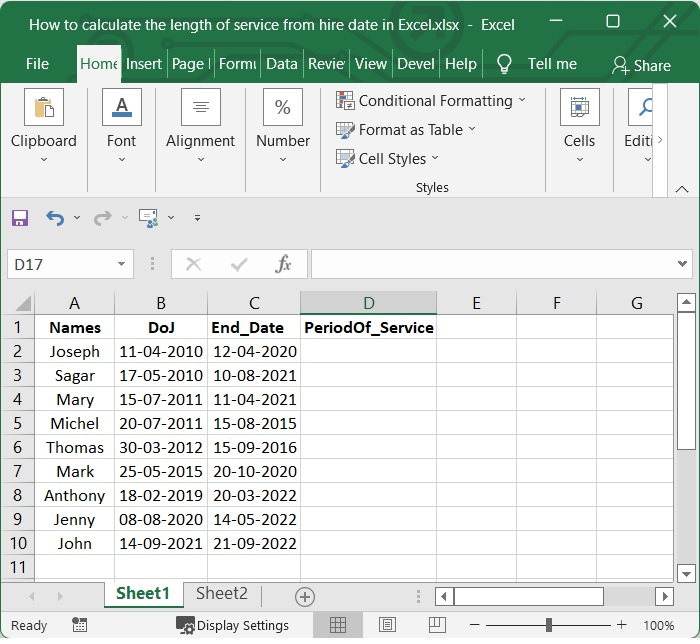 現在讓我們瞭解如何使用Excel根據入職日期計算員工的服務期限。