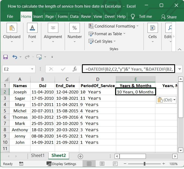 考慮到上面給出的示例,如果您想了解員工以年和月為單位的服務期限,請將以下公式新增到一個空白單元格中。