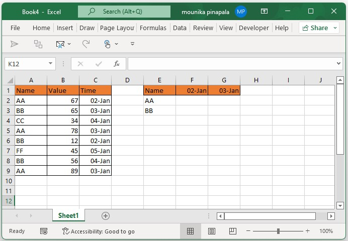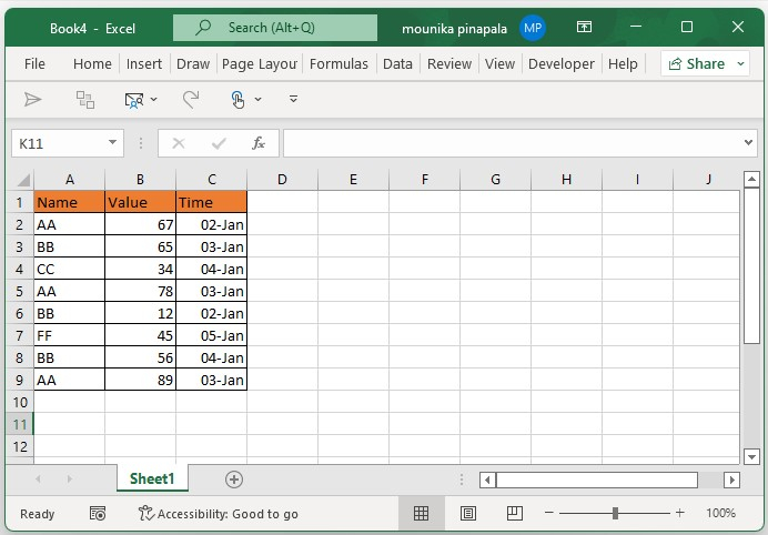開啟一個 Microsoft Excel 表格,並輸入姓名、數值和時間的資料,如下面的螢幕截圖所示,供你參考。