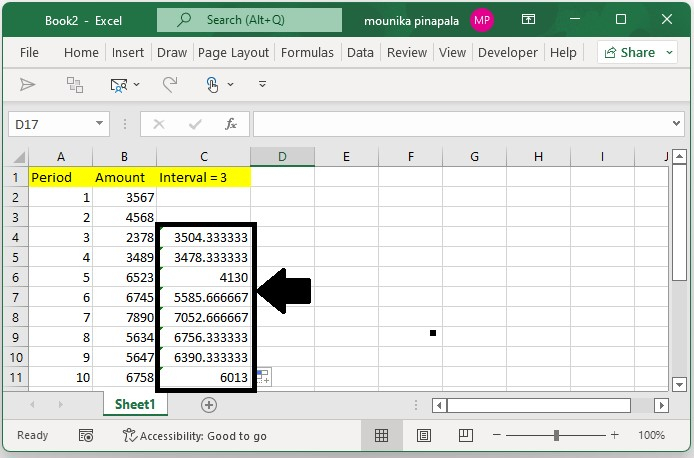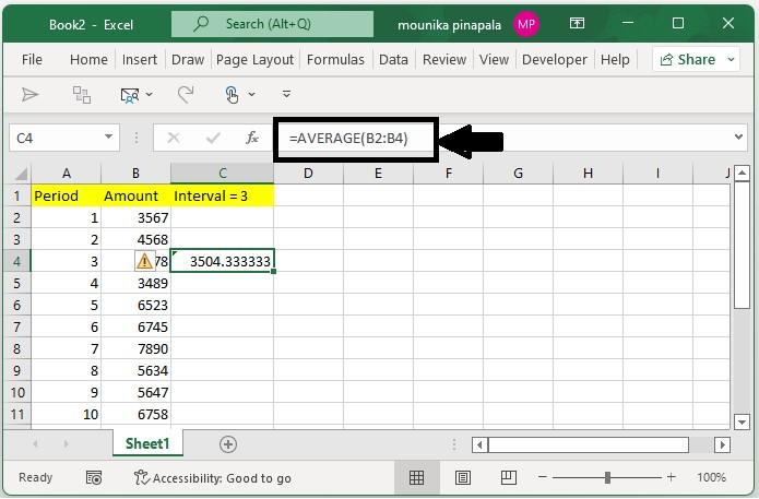注意 − 在上面的公式中,B2:B4表示Excel表格中資料集中前三個資料值。在這裡,您需要計算間隔為3的移動平均值。因此,我們將公式輸入到第三個單元格中。