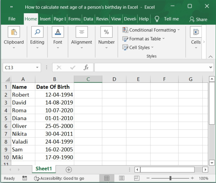 當你在日常對話中問別人“你多大了?”時,期望他們會提供一個表示他們已經生活了多少年的答案。你可以在 Microsoft Excel 中構建一個公式,可以準確地計算一個人的年齡,以月、日、小時甚至分鐘為單位。但由於我們在這裡遵循傳統,所以讓我們先學習如何根據出生日期以年為單位計算年齡。