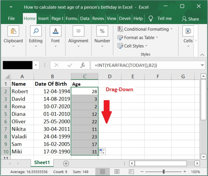 之後,只需將填充柄向下拖動到您希望結果顯示的單元格,所有下一個生日的年齡(取決於出生日期)都將為您計算出來。請參考下面的螢幕截圖。