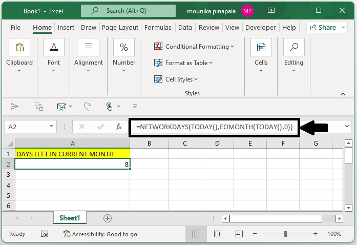 開啟 Microsoft Excel 表格,您需要將上述公式輸入到公式欄或 Excel 表格中的空白單元格中,然後按 Enter 鍵即可獲取當前月份剩餘的工作日數量。請參考以下螢幕截圖。