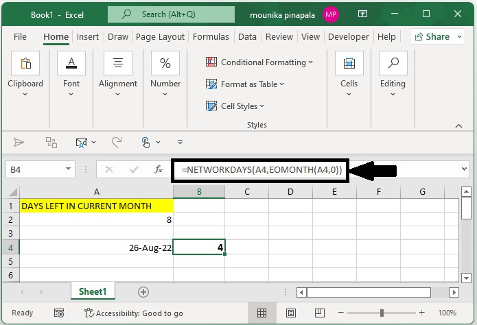 假設您想使用以下公式計算從今天(今天是 2022 年 8 月 22 日)到本月結束剩餘的工作日數量。