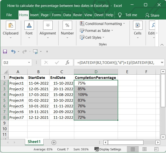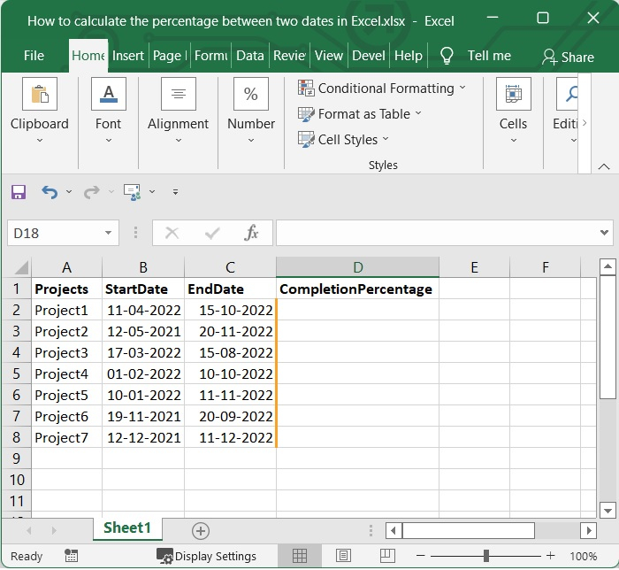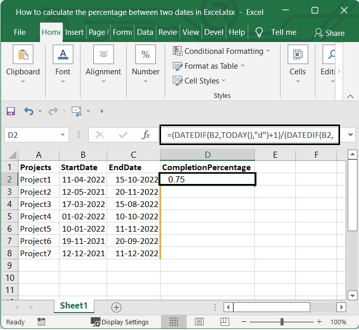 我們有一些專案的開始日期和結束日期,如下面的影像所示。我們必須計算專案的完成百分比。