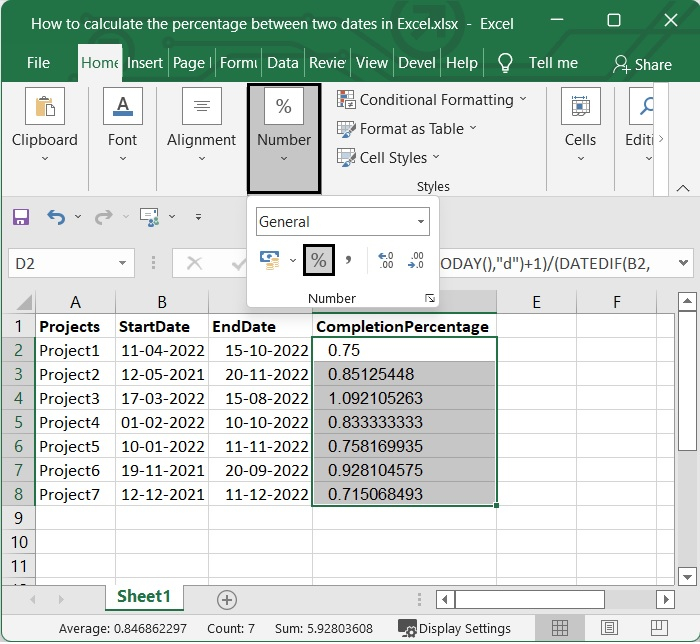 應用公式後,您將獲得通用格式的值。要將其更改為百分比樣式,請選擇包含公式的單元格,然後單擊“開始”選項卡“數字”組中的“百分比”樣式。