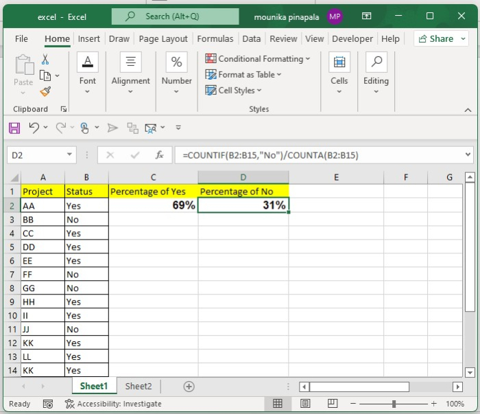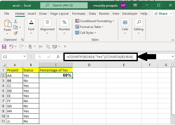 =COUNTIF(B2:B14,"Yes")/COUNTA(B2:B14)