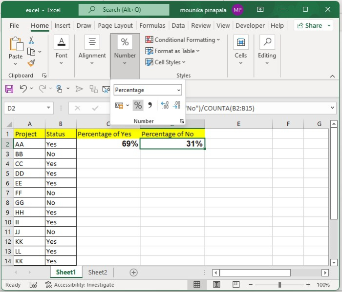 在上式中,B2:B14 是您要計算 Yes 和 No 百分比的列表。請確保值之間沒有任何空格,否則公式將返回零結果。