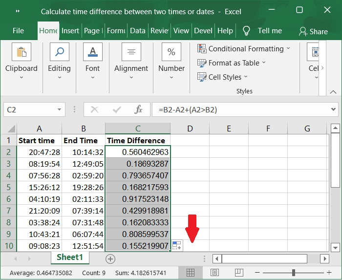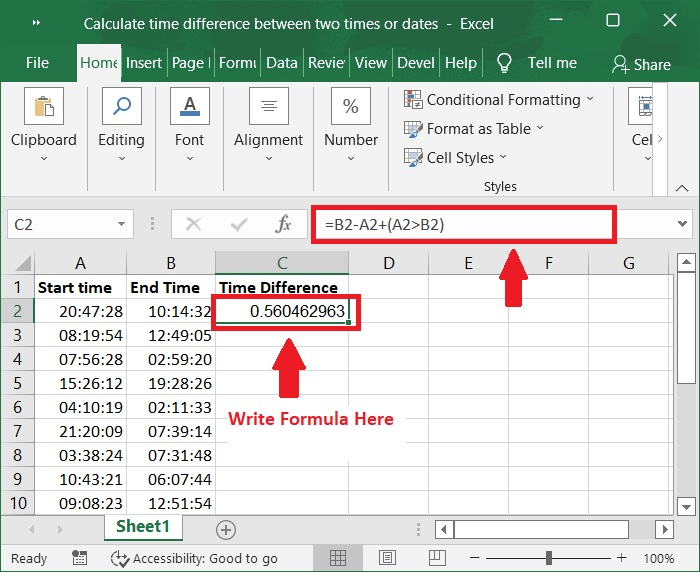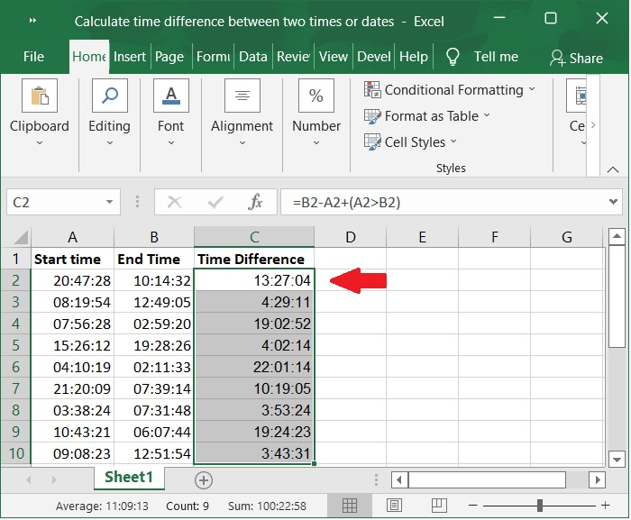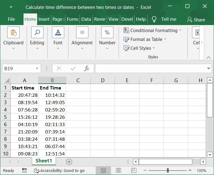 這裡,單元格 A2 顯示開始時間,單元格 B2 顯示結束時間,但是您可以根據需要交換時間。請參考下面的螢幕截圖。