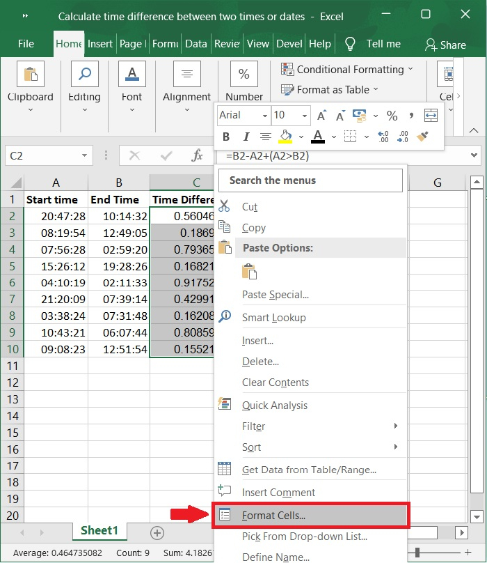 下一步是將數值轉換為時間格式。右鍵單擊結果範圍(在本例中為 C2:C10),然後從右鍵單擊時出現的上下文選單中選擇“設定單元格格式”。下面的螢幕截圖是相同的。