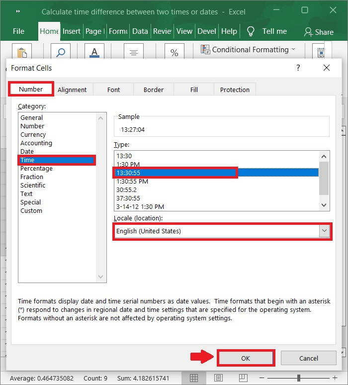 然後,將顯示“設定單元格格式”對話方塊,選擇“數字”選項卡,然後單擊“時間”。然後,在右側區域,選擇所需的時間格式,然後單擊“確定”按鈕關閉對話方塊。請檢視下面的螢幕截圖。