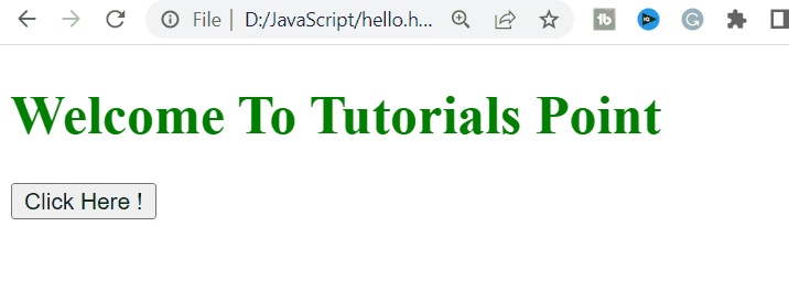 <!DOCTYPE html> <html> <body> <h1 style="color: green;"> Welcome To Tutorials Point </h1> <input type="button" onclick="clickEvent();" value="Click Here !" /> <script> function clickEvent() { alert("Hey... The Javascript function is invoked."); } </script> </body> </html>