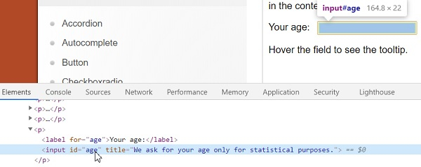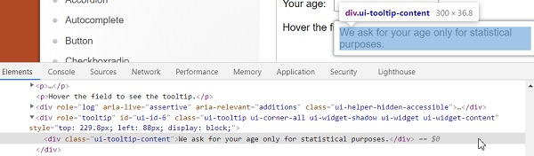 a.moveToElement(m).perform();讓我們捕獲工具提示文字 - 我們僅出於統計目的要求您的年齡,在將滑鼠懸停在標籤為“您的年齡”的編輯框上時獲得。