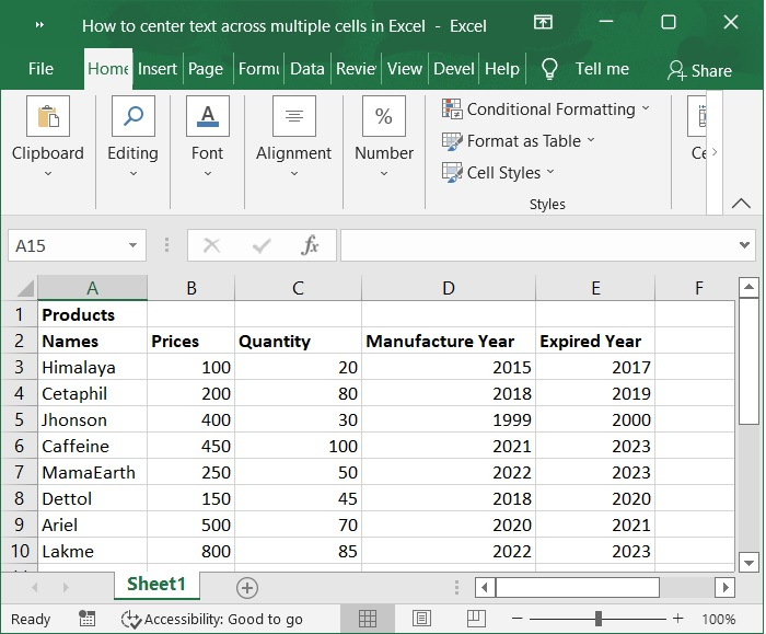 儘管“跨列居中”工具欄按鈕不再可用,但仍然可以在不合並單元格的情況下跨列居中文字。為此,請按照以下說明操作。