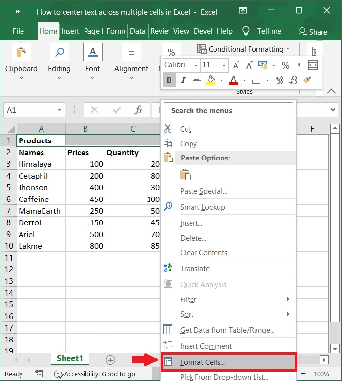 您可以透過選擇要居中的文字,右鍵單擊以調出上下文選單,然後使用“設定單元格格式”選項來跨選定區域居中文字。請參考下面的螢幕截圖。