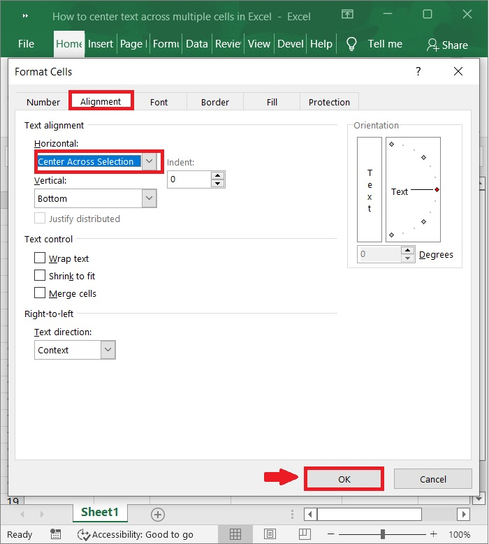 然後單擊“確定”按鈕。文字將被排列,使其居中於所選區域。請參考下面的螢幕截圖。