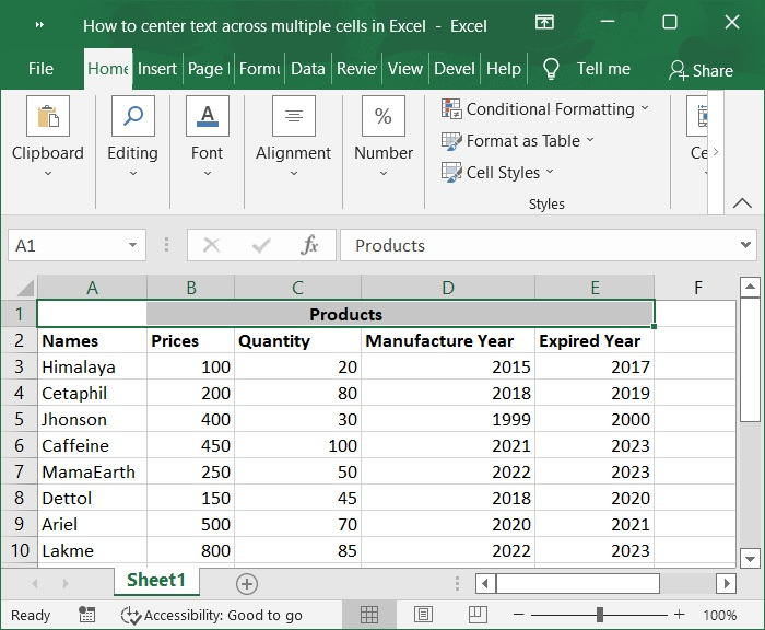 在本教程中,我們使用了一個簡單的示例來演示如何在不合並單元格的情況下在 Excel 中跨多個單元格居中文字。
