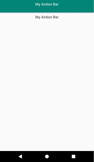 <?xml version="1.0" encoding="utf-8"?> <RelativeLayout xmlns:android="http://schemas.android.com/apk/res/android" xmlns:tools="http://schemas.android.com/tools" android:layout_width="match_parent" android:layout_height="match_parent" android:padding="4dp" tools:context=".MainActivity"> <TextView android:padding="4dp" android:layout_width="match_parent" android:layout_height="wrap_content" android:text="My Action Bar" android:gravity="center" android:textSize="16sp" android:textStyle="bold"/> </RelativeLayout>