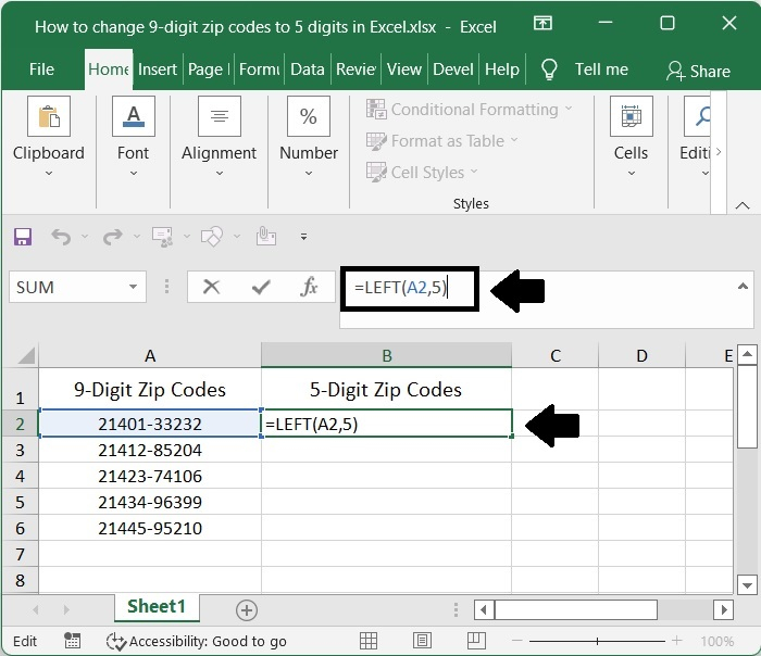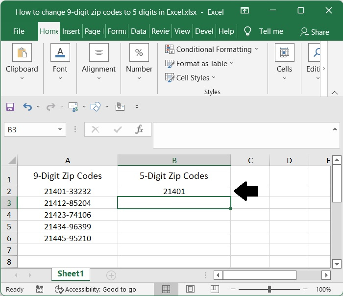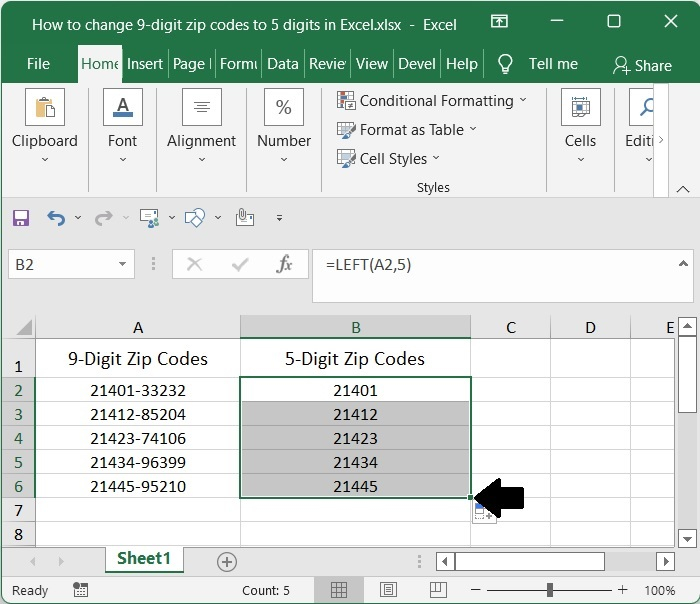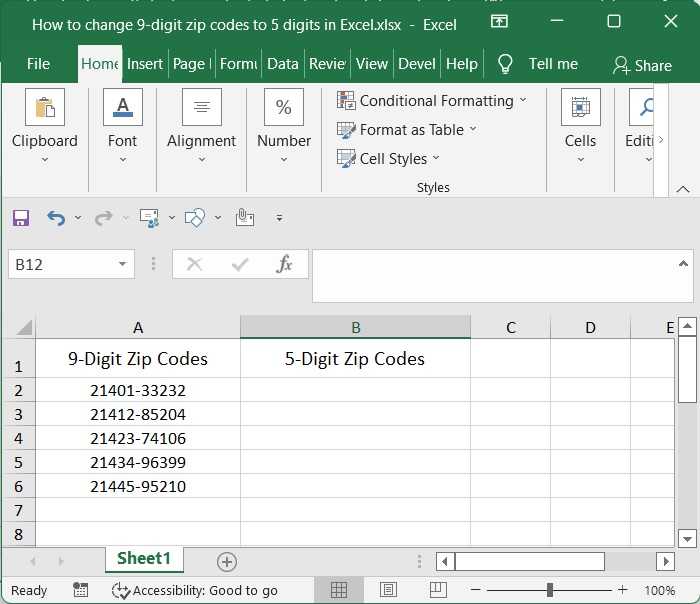 在本教程中,我們使用了一個簡單的示例來演示如何在 Excel 中將 9 位數郵政編碼更改為 5 位數郵政編碼。
