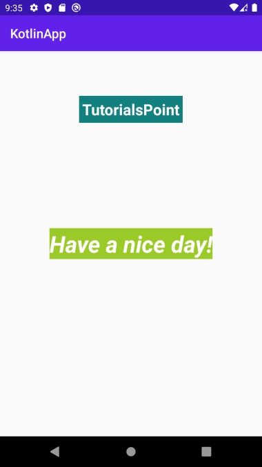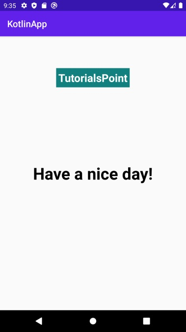 <?xml version="1.0" encoding="utf-8"?> <RelativeLayout xmlns:android="http://schemas.android.com/apk/res/android" xmlns:tools="http://schemas.android.com/tools" android:layout_width="match_parent" android:layout_height="match_parent" tools:context=".MainActivity"> <TextView android:layout_width="wrap_content" android:layout_height="wrap_content" android:layout_centerHorizontal="true" android:layout_marginTop="70dp" android:background="#008080" android:padding="5dp" android:text="TutorialsPoint" android:textColor="#fff" android:textSize="24sp" android:textStyle="bold" /> <TextView android:id="@+id/textView" android:layout_width="wrap_content" android:layout_height="wrap_content" android:layout_centerInParent="true" android:text="Have a nice day!" android:textColor="@android:color/background_dark" android:textSize="36sp" android:textStyle="bold" /> </RelativeLayout>