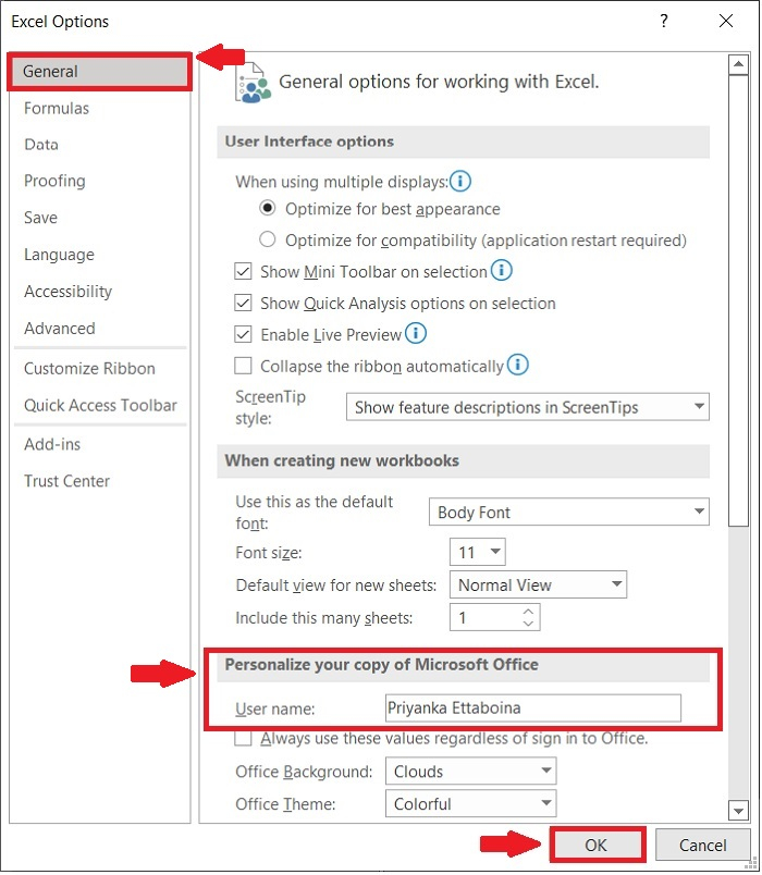 單擊 Excel 選項對話方塊左側的“常規”選單,然後在對話方塊的“個性化您的 Microsoft Office 副本”部分的“使用者名稱”文字框中輸入一個新的使用者名稱。只需選擇“確定”按鈕即可。請參閱下面的螢幕截圖以瞭解相同內容。