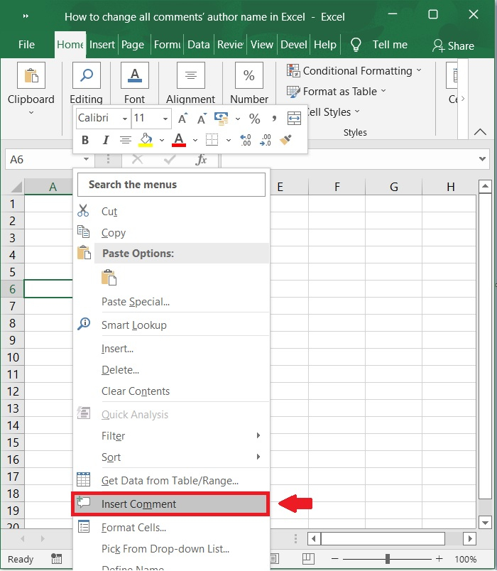 現在,選擇任何單元格,在下面的螢幕截圖中,我們選擇了單元格 A6。右鍵單擊並從下拉列表中選擇“插入批註”選項。