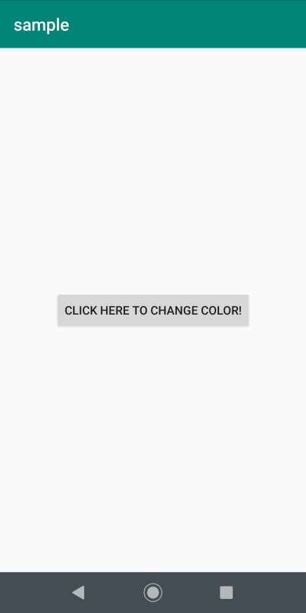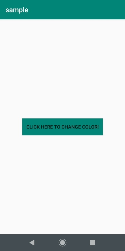 <?xml version="1.0" encoding="utf-8"?> <android.support.constraint.ConstraintLayout xmlns:android="http://schemas.android.com/apk/res/android" xmlns:app="http://schemas.android.com/apk/res-auto" xmlns:tools="http://schemas.android.com/tools" android:layout_width="match_parent" android:layout_height="match_parent" tools:context=".MainActivity"> <Button android:id="@+id/button" android:layout_width="wrap_content" android:layout_height="wrap_content" android:text="Click here to change color!" app:layout_constraintBottom_toBottomOf="parent" app:layout_constraintLeft_toLeftOf="parent" app:layout_constraintRight_toRightOf="parent" app:layout_constraintTop_toTopOf="parent" tools:ignore="HardcodedText" /> </android.support.constraint.ConstraintLayout>